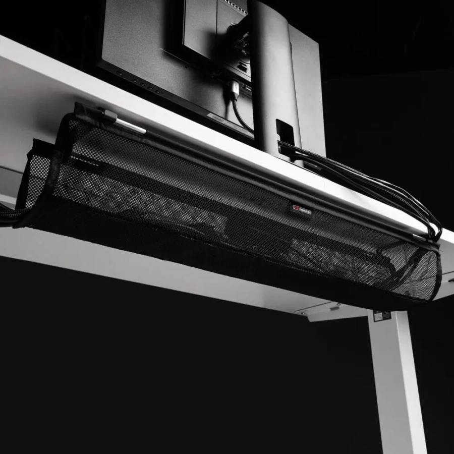 - Кабельный органайзер под столом: позволяет аккуратно хранить лишние кабели, удлинители и блоки питания на полу, не создавая беспорядка на рабочем месте