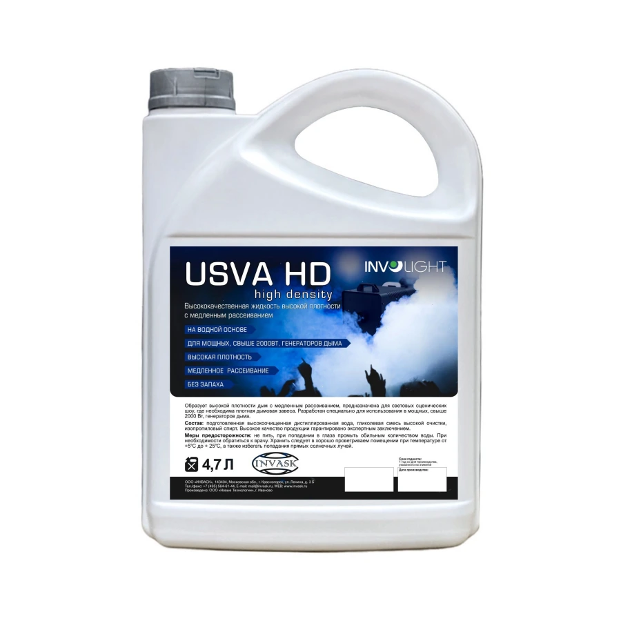 USVA HD разработана специально для использования в мощных, свыше 2000Вт, генераторов дыма. Жидкость на водной основе, без запаха, сверх высокой плотности с медленным рассеиванием для мощных генераторов дыма. Образует густой, холодного белого цвета, дым (high density). Предназначена для световых сценических шоу, где необходима плотная дымовая завеса.