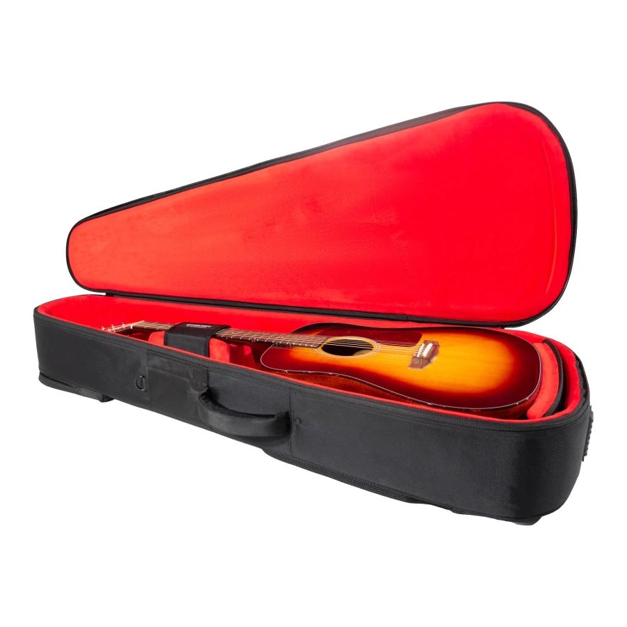 Плотный полужесткий чехол для акустической гитары типа дредноут. Изготовлен из нейлона с мягкой внутренней подкладкой из красного бархата