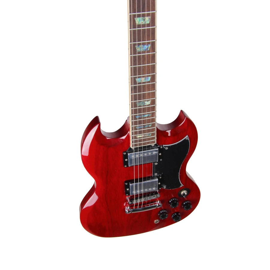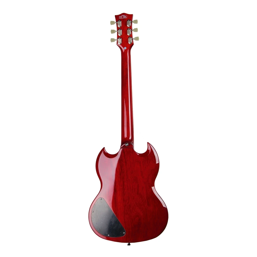 Форм-фактор: Даблкат (Double Cut, Solid Guitar – SG) Мензура: 628 мм (24,75 дюймов) Корпус: махагони Гриф: вклеенный, махагони Ширина грифа у верхнего порожка: 42 мм Лады: никель, закруглённые с торцов, 22 шт. Накладка грифа: лаурель с окантовкой из кремового пластика, инкрустация маркеров ладов трапециями перламутрового цвета. Звукосниматели: H+H Ceramic (2 керамических хамбакера с хромированными крышками) Управление электроникой: 2V/2T/3P (два регулятора громкости, два регулятора тембра, трёхпозиционный тумблер) Бридж: типа тюноматик, с подстройкой мензуры для каждой струны, хром Колки: хромированные, винтажного типа с пластиковыми бутонами кремового цвета Цвет: полупрозрачный вишнёво-красный
