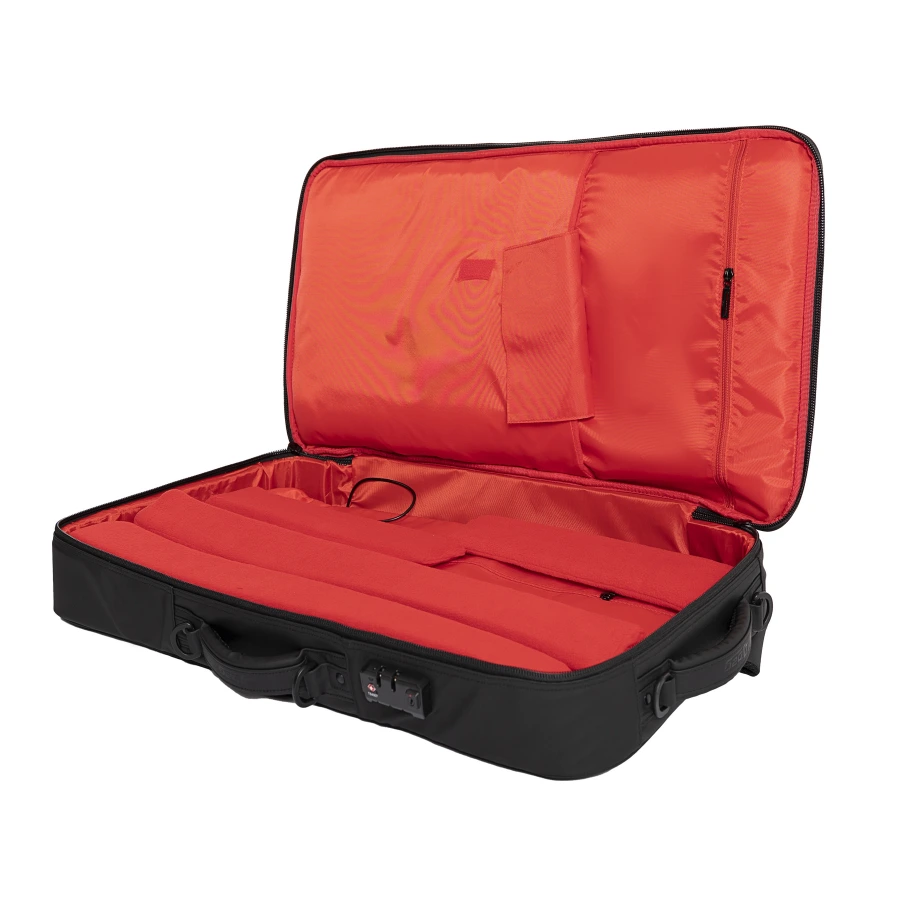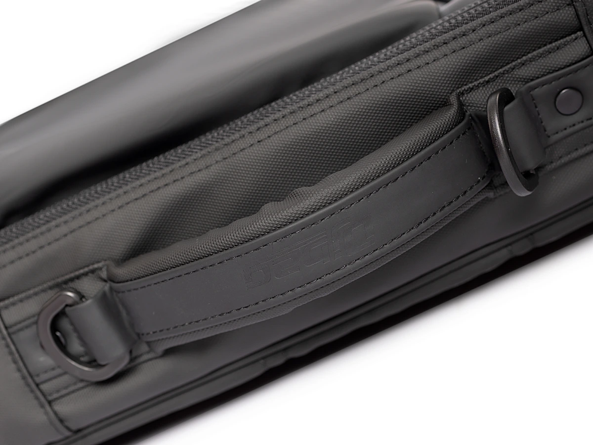 Сумка имеет пластиковый каркас толщиной 2 мм от боковых ударов с улучшенной защитой из мягкого Эва толщиной 10 мм по периметру основного отделения сумки. Модель имеет две эргономичные ручки для транспортировки, а также специальные мягкие ремни с карманом для банковских карт для использования сумки в качестве рюкзака, который легко убирается в специальный карман.