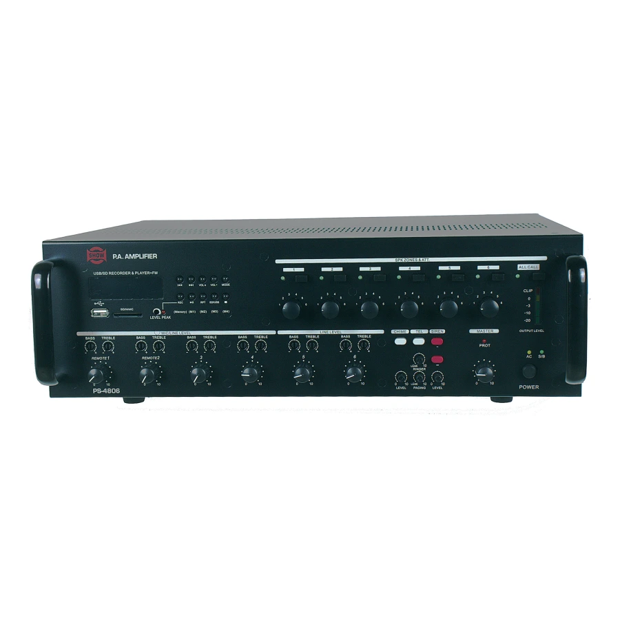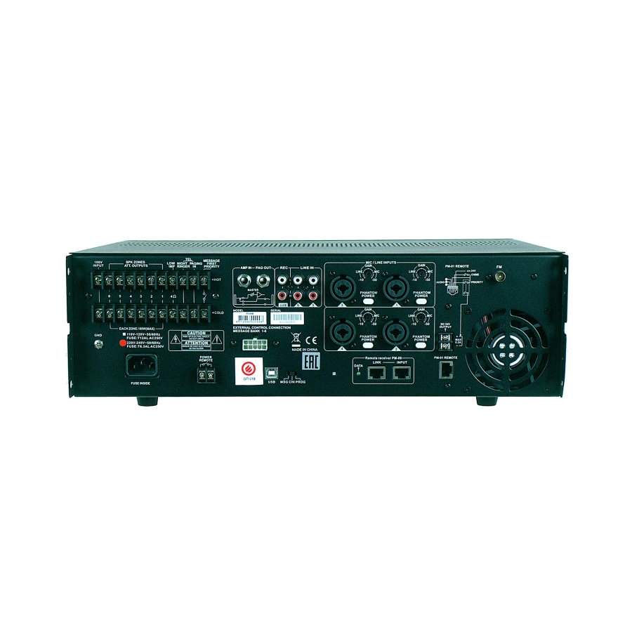 4 Ом - 480 Вт 70/100 В - 80 Вт на каждую зону ( 80х6=480 Вт) Частотный диапазон при -3 дБ: 80 Гц - 16 кГц MP3 плеер с поддержкой MMC, micro SD, mini SD, поддерживаемые форматы MP3, WMA, WAV, ACC 6 зон без возможности регулировки уровня громкости и тембра в каждой зоне. MP3 плеер с возможностью записи FM 87.5 - 108 МГц Сигнал оповещения - колокольчик Сигнал тревоги - сирена Размеры: 444х367х130 мм Вес: 15,9 кг