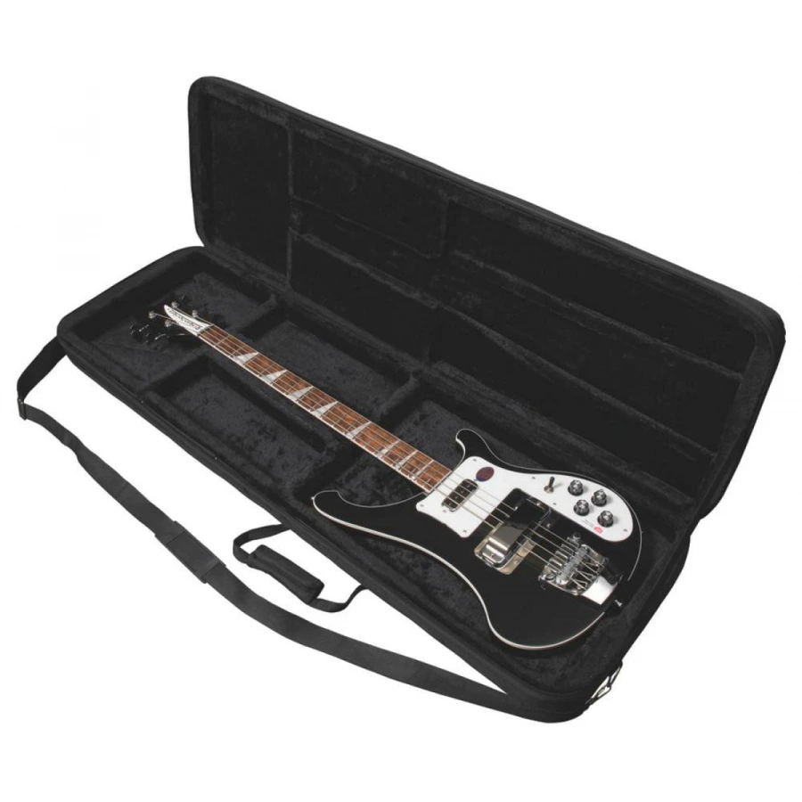 Сверхпрочный кейс для бас-гитары. Две ручки для переноски и регулируемый плечевой ремень для легкой, хорошо сбалансированной перевозки. Формованная плюшевая подкладка надежно защитит инструмент. Интегрированный отсек идеально подходит для запасных струн и других аксессуаров. длина - 1251 мм ширина- 390 мм толщина - 127 мм