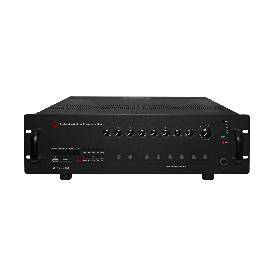 Комбинированный усилитель для трансляции и оповещения. 4 комбинированных балансных входа Входные RCA-разъемы PRE-выходной MP3 плеер ( MP3-500 ) +USB / MMC / SD интерфейс, с функцией записи и FM-тюнер. 1 вход с mute функцией Регулятор низких и высоких частот Индивидуальный контроль громкости для каждого входа Вентилятор охлаждения Схема защиты: перегрузки по току, защита от перенапряжения и короткого замыкания Светодиодный индикатор выходного уровня Мощность: RMS 680 Вт/макс.720 Вт АЧХ: 50 Гц-17 кГц Фантомное питание 48 В. Регулятор тембра НЧ: ±10 дБВ (100 Гц); ВЧ: ±10 дБВ (10 кГц) Коэффициент гармоник: <0.5% Сопротивление: 4, 8, Ом Выходное напряжение: 70 В, 100 В Функция сирены Зоны - 5 Телефонный пейджинг Приоритет первого какнала 4 Тоновых сигнала Тюнер - FM Размеры (ШxГxВ) 482x440x150 мм Вес -15 кг