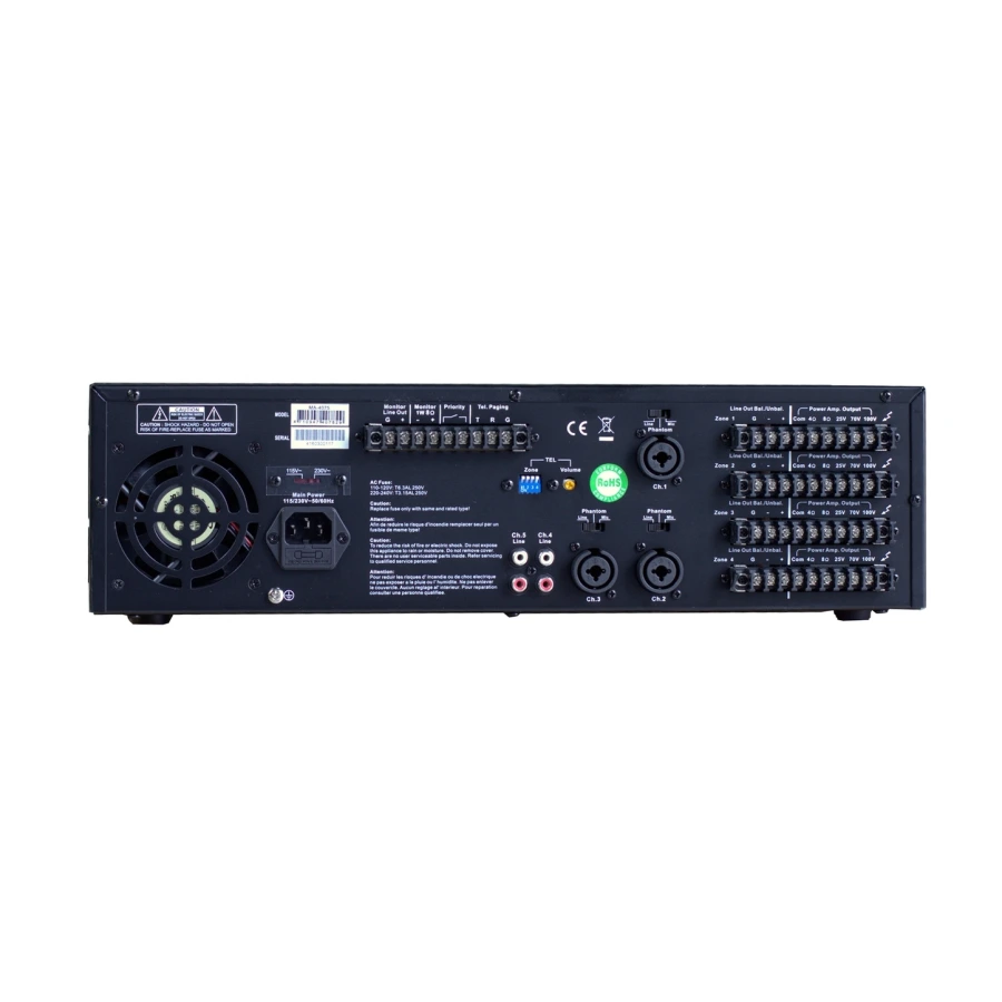 Уникальный трансляционный усилитель мощности позволяющий реализовать всевозможные варианты коммутации входного и выходного сигнала. Вход - CН1-СР3 Mic симметричный ( XLR) Фантомное питание: 15 В Вход - CH4-CH5 линейный (тюльпан) . Выходная мощность 4 канала по 40 Вт. Выходное напряжение 25В/50В/100В Сопротивление нагрузки 4 Oм/8 Oм Возможность назначить каждому из пяти каналов от 1 до 4 зон Мониторная линия 1 Вт Выход на наушники 0.5 Вт,47 Ом Частотный диапазон 60Гц-17кГц. Размеры: 483х132х310мм.