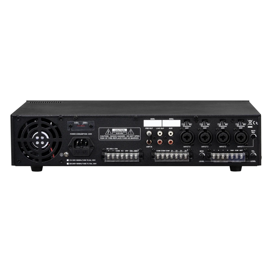 Питание - 115/230 В 50-60Гц Аварийное питание - DC 24 В. Входа - 4 микр./линейный (Jack 6,3), симетричный (XLR), фантомное питание Приоритет первого микрофона Вход дополнительный: AUX (RCA) c регулировкой громкости, тембра НЧ,ВЧ Дополнительная функция - MP3 плеер SD/MMC USB интерфейс, с возможностью записи Количество зон - 4 ( 100 В ) (регулировка уровня, функция ВКЛ/ВЫКЛ) Диапазон частот - 80 Гц - 16 кГц . Размеры - 420х260х88 мм Вес - 10,2 кг.