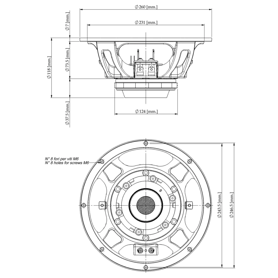 Высокомощная среднебасовая динамическая головка Диаметр: 10’’ Импеданс: 8 Ом Мощность AES: 350 Вт Мощность программная: 500 Вт Мощность пиковая: 1000 Вт Максимальная рекомендованная частота: 2000 Гц Чувствительность: 99 дБ Частотный диапазон: 65...5000 Гц Диаметр катушки: 2.56' ISV Магнит: неодим Погодозащищённый, пригоден для наружного использования Идеален для двух и многополосных систем