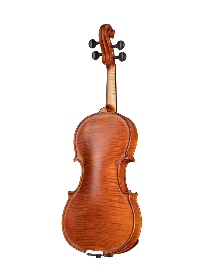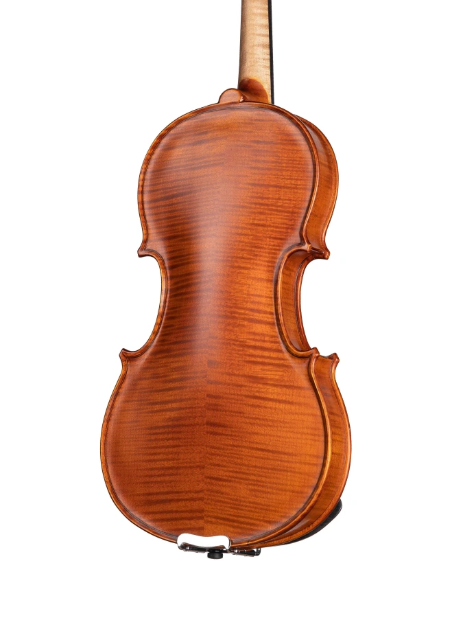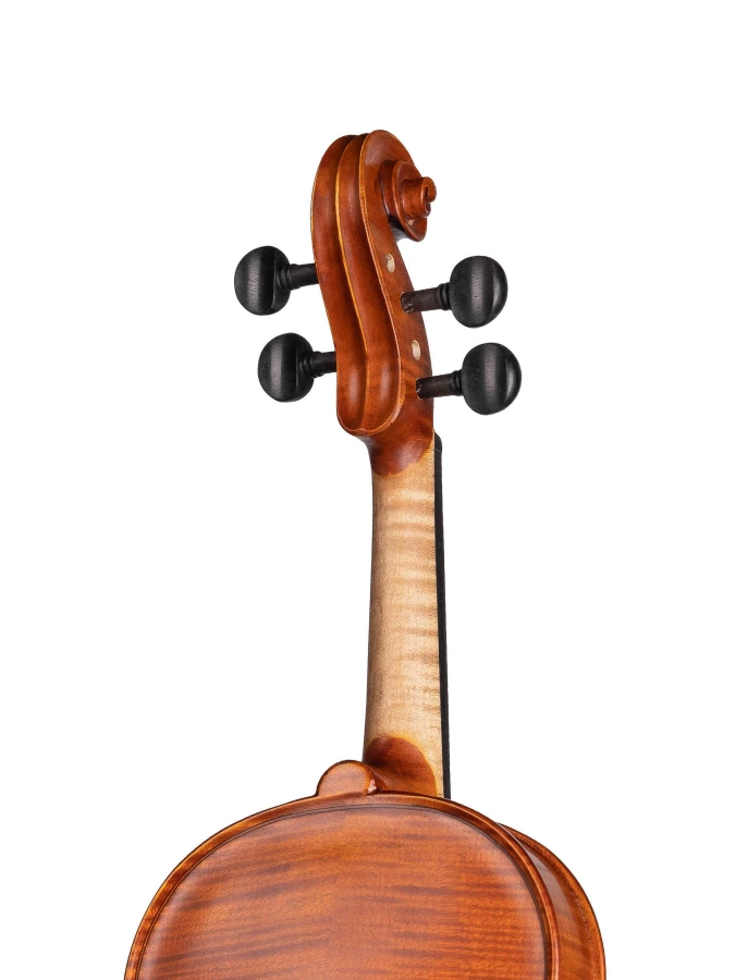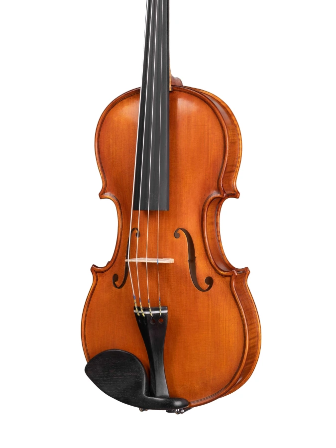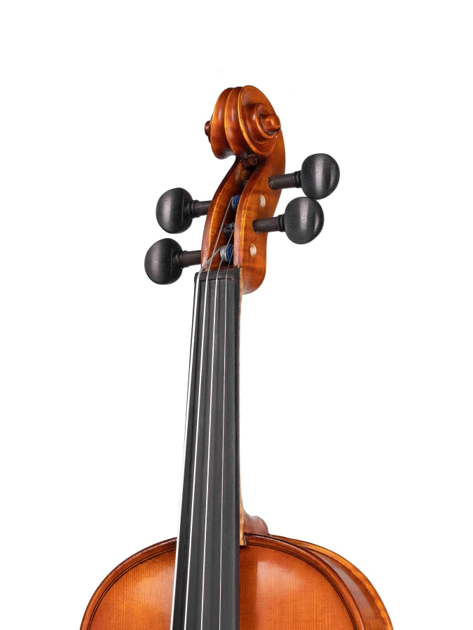 Изготовленный вручную инструмент с верхней декой из массива ели, кленовой задней декой и обечайками и деревянным кантом. Колки, накладка грифа, подбородник и струнодержатель из черного дерева. Инструмент вручную покрыт масляным лаком.