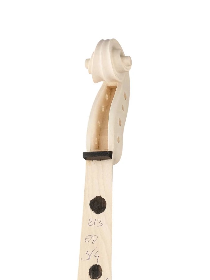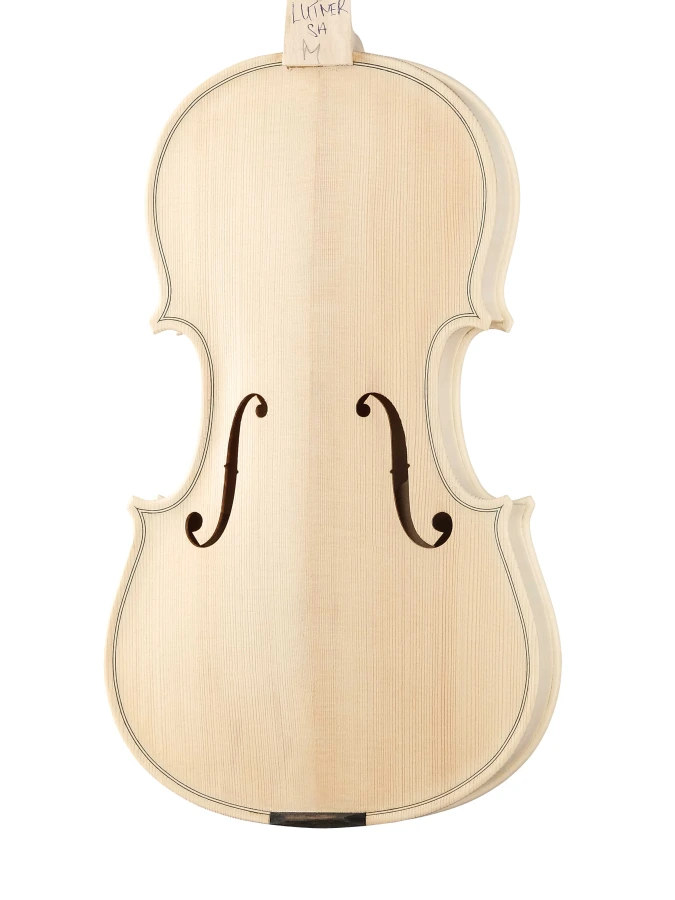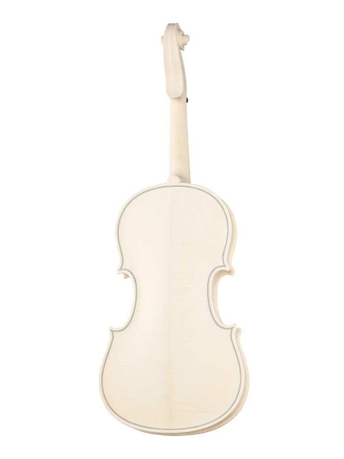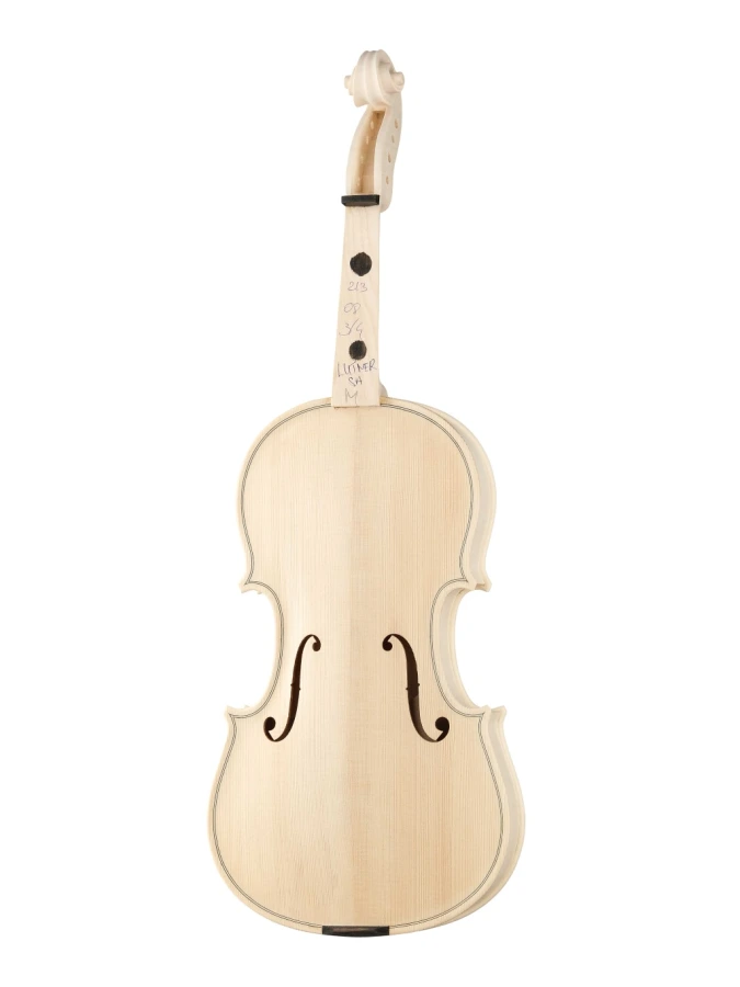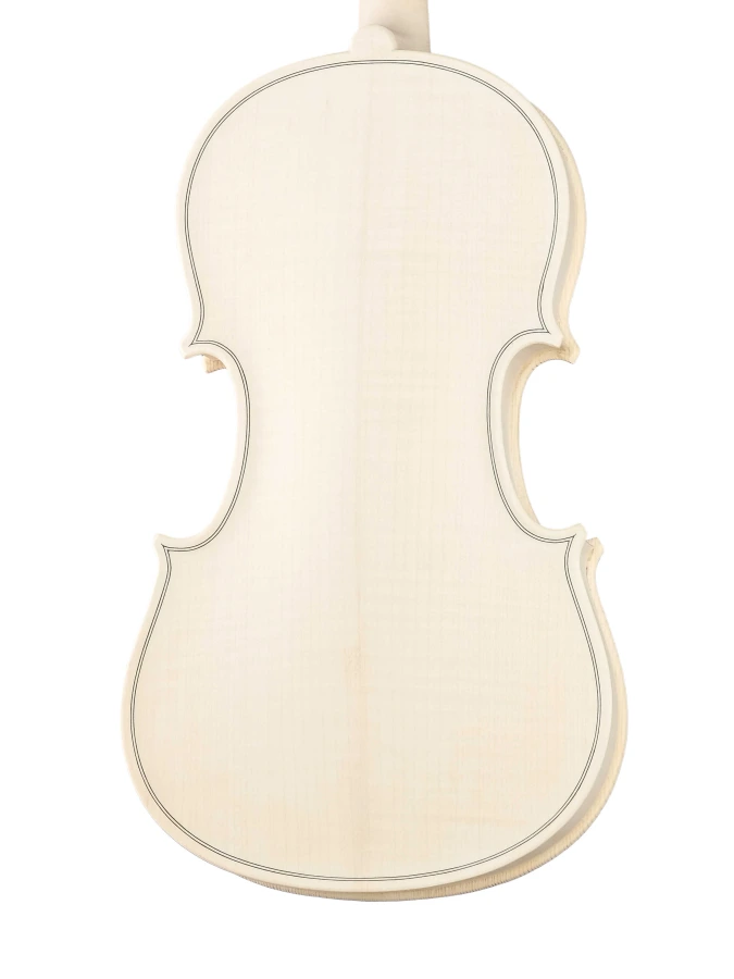 Изготовленный вручную инструмент с верхней декой из массива ели, кленовой задней декой и обечайками и деревянным кантом. Без отделки, цвет натуральный.