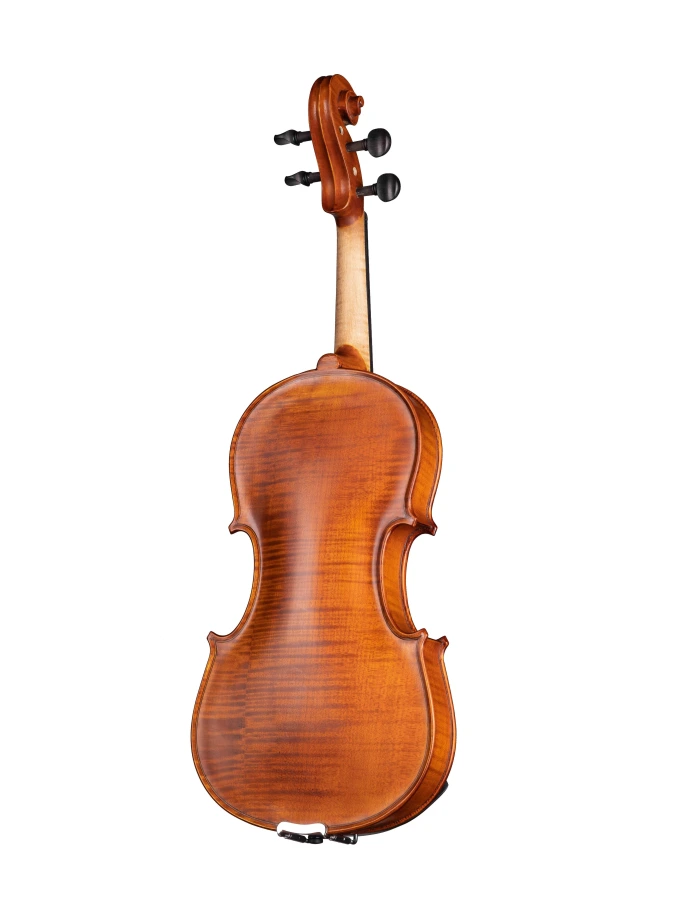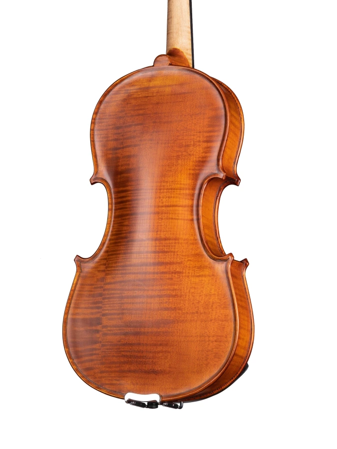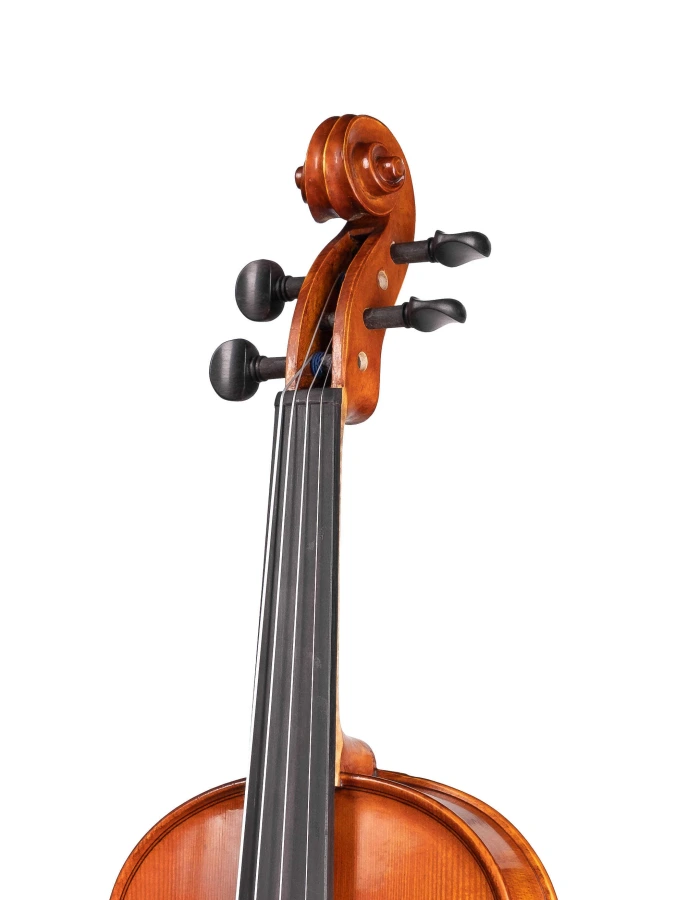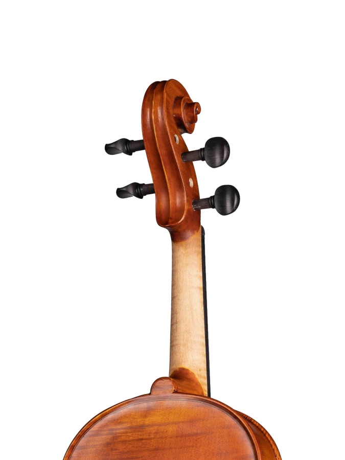 Изготовленный вручную инструмент с верхней декой из массива ели, кленовой задней декой и обечайками и деревянным кантом. Колки, накладка грифа, подбородник и струнодержатель из черного дерева. Инструмент вручную покрыт масляным лаком.
