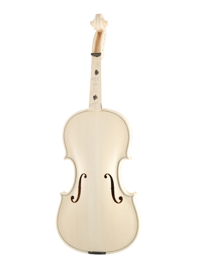 Изготовленный вручную инструмент с верхней декой из массива ели, кленовой задней декой и обечайками и деревянным кантом. Без отделки, цвет натуральный.