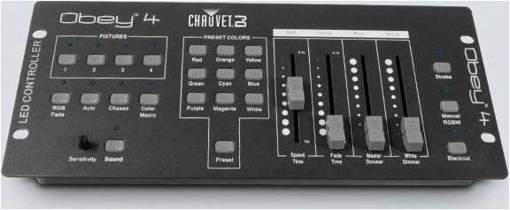CHAUVET Obey 4 -это компактный контроллер DMX для LED-освещения с 3- или 4-канальными режимами - красный, зеленый, синий и бело/янтарного цвета для легкого контроля смешивания. Он имеет встроенный автоматизированный звук, активированное или ручное воспроизведение опции и может контролировать приборы в четырех различных зонах-независимо друг от друга. Одним нажатием кнопки активизируются предварительно смешанные цвета, встроенные "преследования", а стробоскоп и диммер управления делают его идеальным для новичков в освещении или для тех, кто ищет легкий способ управления.