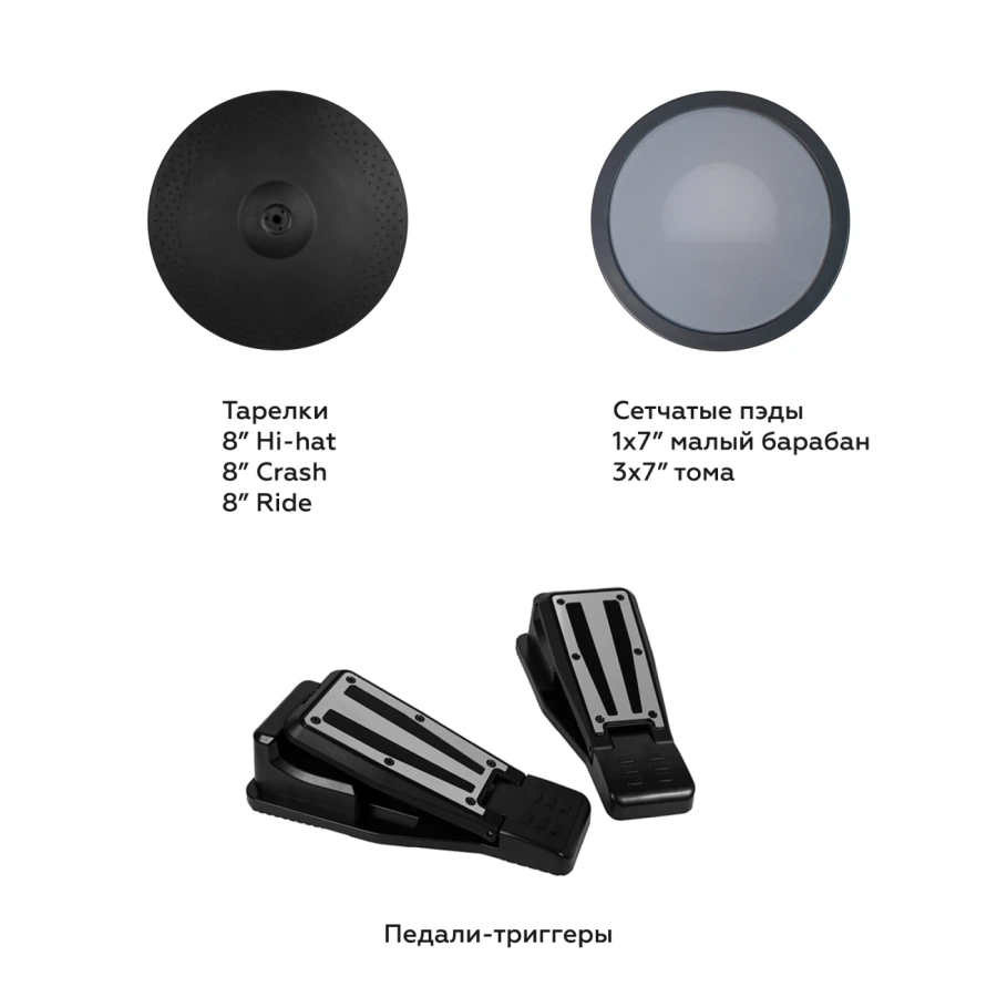 Однозонные сетчатые пэды и тарелки: 7 малый барабан, 7 томы, 8 Hi-hat, 8 Crash, 8 Ride).
