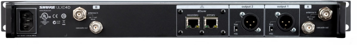 Приёмник Shure ULXD4D оснащен Ethernet-портами, позволяющими осуществлять удаленный мониторинг частотных характеристик, а также выполнять настройки используя ПО Wireless Workbench 6. Для подключения звуковыводящего оборудования имеются разъемы XLR и 1/4".