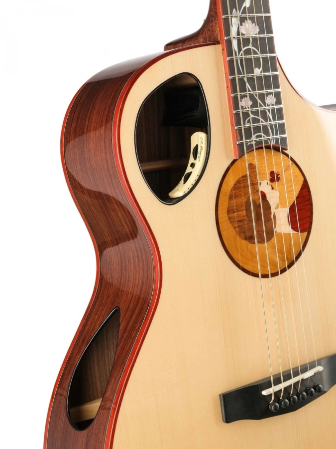 Вдохновленная декоративно-прикладным искусством эпохи ар-нуво 19-го века, Roselyn Redux является настоящим шедевром, сочетающим в себе как классическую, так и современную эстетику и методы изготовления гитар. Все началось с тщательно обработанной деревянной вставки в центре гитары с портретом молодой женщины, держащей розу, и так родилось имя Розелин. Уникальные особенности, такие как смещенное звуковое отверстие сверху и звуковое отверстие сбоку, скошенный срез на подлокотнике корпуса и элегантная вставка из перламутра в виде виноградной лозы/цветка, которая ответвляется от центральной вставки, вносят свой вклад в красоту и уникальность Roselyn Redux.