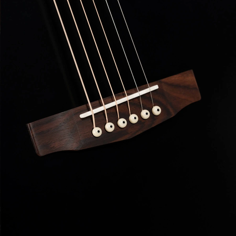 Накладка грифа и подставка из палисандра создают гармоничное сочетание, придавая звучанию насыщенный характер. Плотные, маслянистые свойства палисандра способствуют тёплому, сбалансированному звучанию с исключительным сустейном. Гладкая поверхность накладки грифа повышает удобство игры, а бридж эффективно передаёт вибрации струн корпусу гитары, усиливая общий резонанс инструмента.