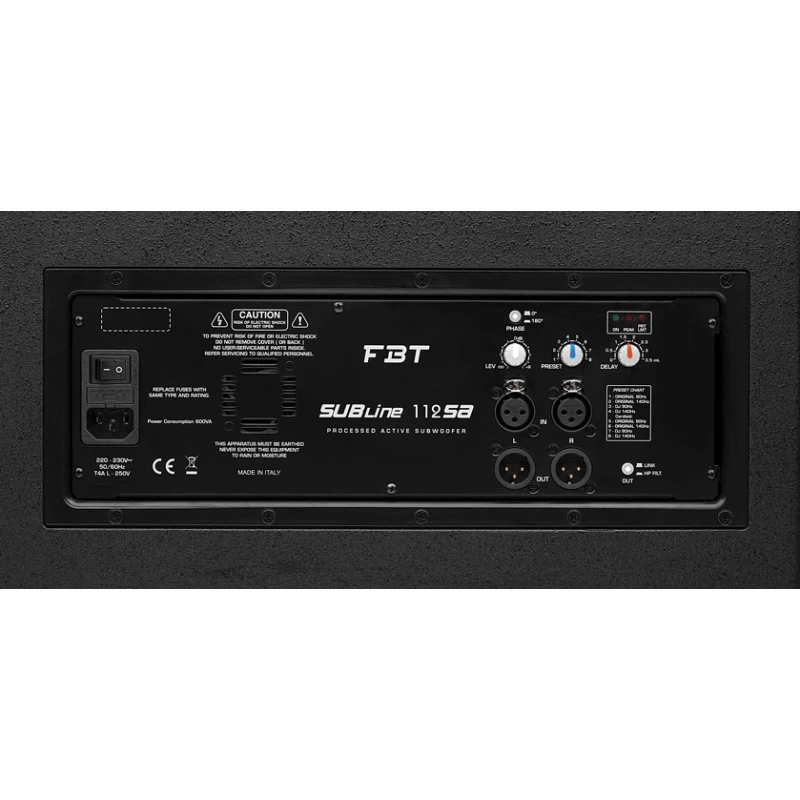 112SA - прекрасный активный сабвуфер итальянского производства из серии SUBLINE от компании FBT. Он одинаково хорошо подойдет как для воспроизведения фоновой музыки, например в барах или ресторанах, так и для установки в религиозных учреждениях, школах, конференц-залах и клубах.
