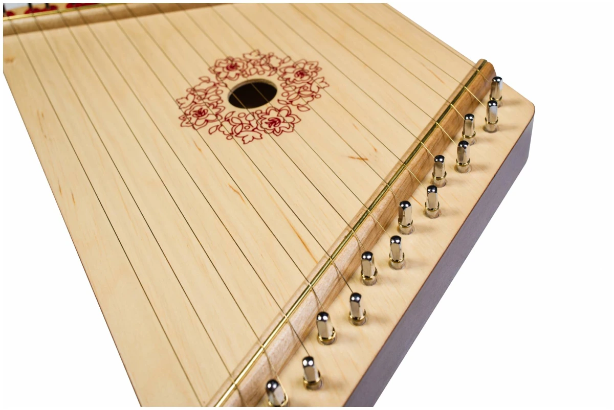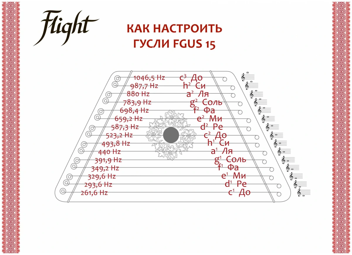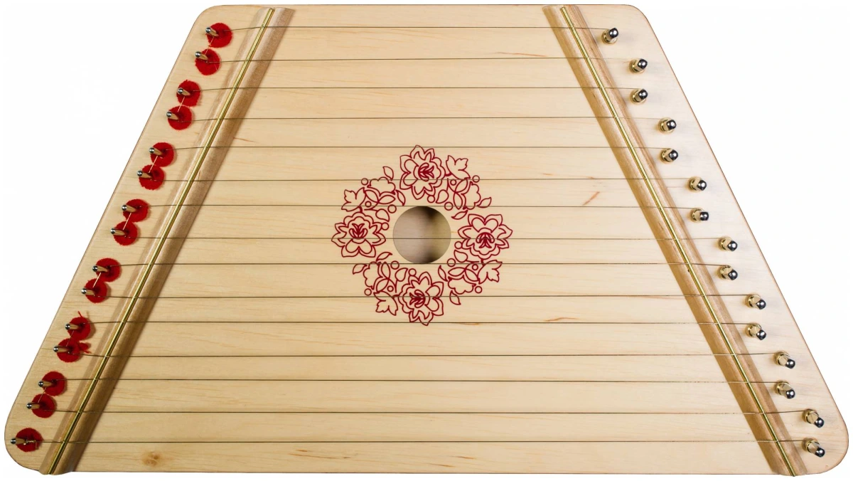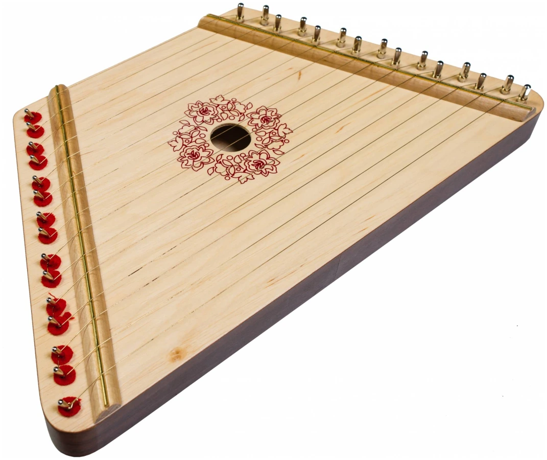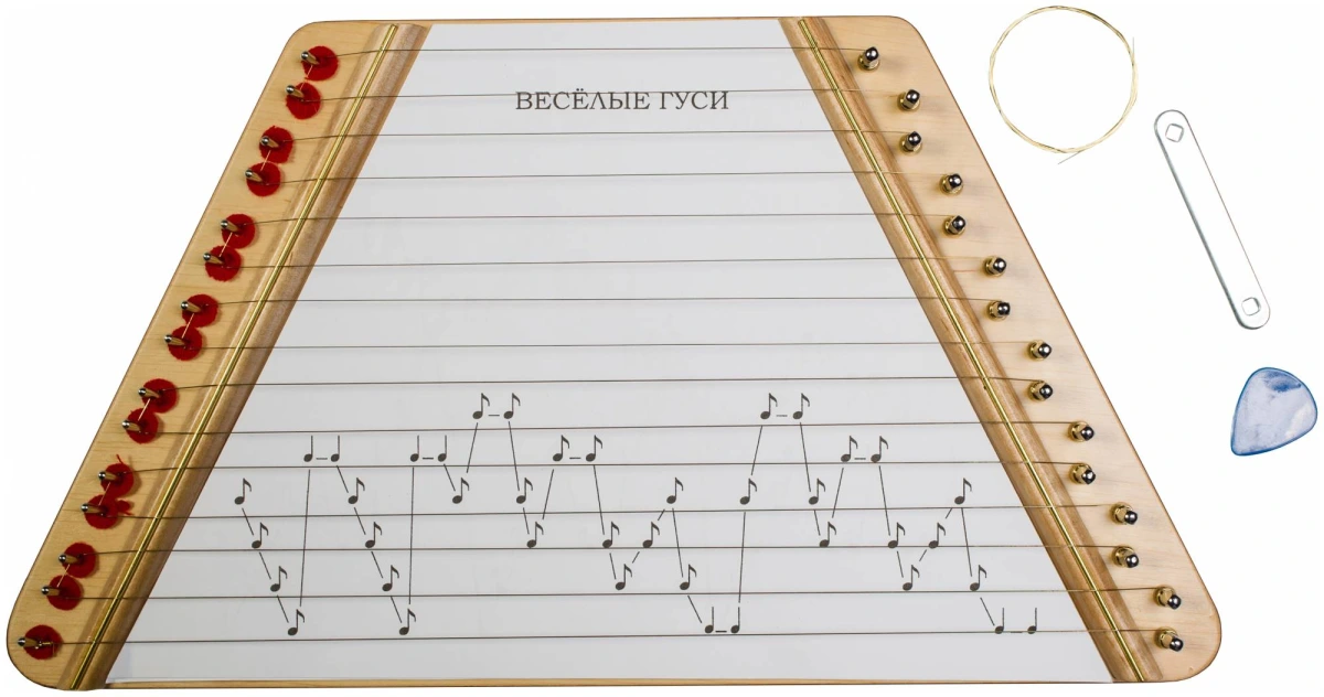 Гусли легко настроить прилагающимся в комплекте ключом: просто крутите колок по часовой стрелке если хотите натянуть струну или против часовой, что бы ослабить ее. Играть на гуслях можно как пальцами, так и медиатором входящим в комплект.