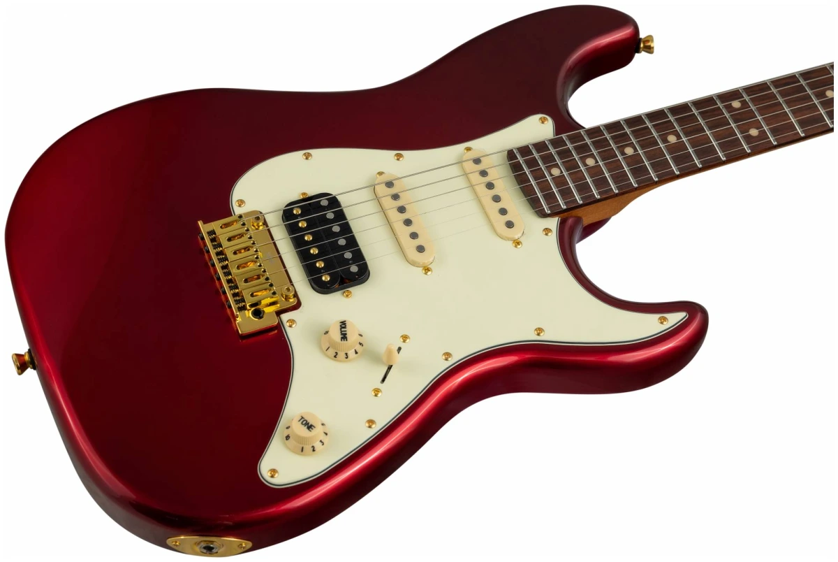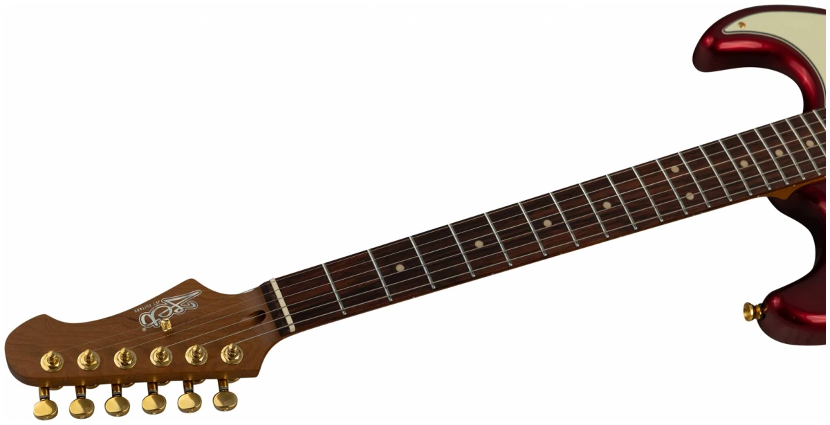 Накладка на гриф выполнена из палисандра с винтажными маркерами Clay Dots, локовые колки, золотая фурнитура и тремоло, звукосниматели HSS Alnico с хамбакером в бридже черного цвета, накладка и ручки управления кремового цвета – в JET JS-480 WR G все продумано до мелочей.
