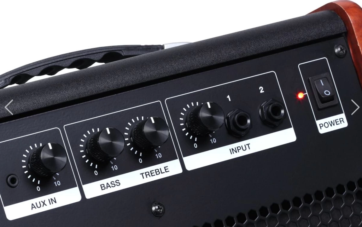Управление: высокие частоты, низкие частоты, громкость Aux, громкость входа, выключатель питания.