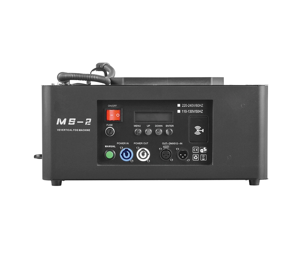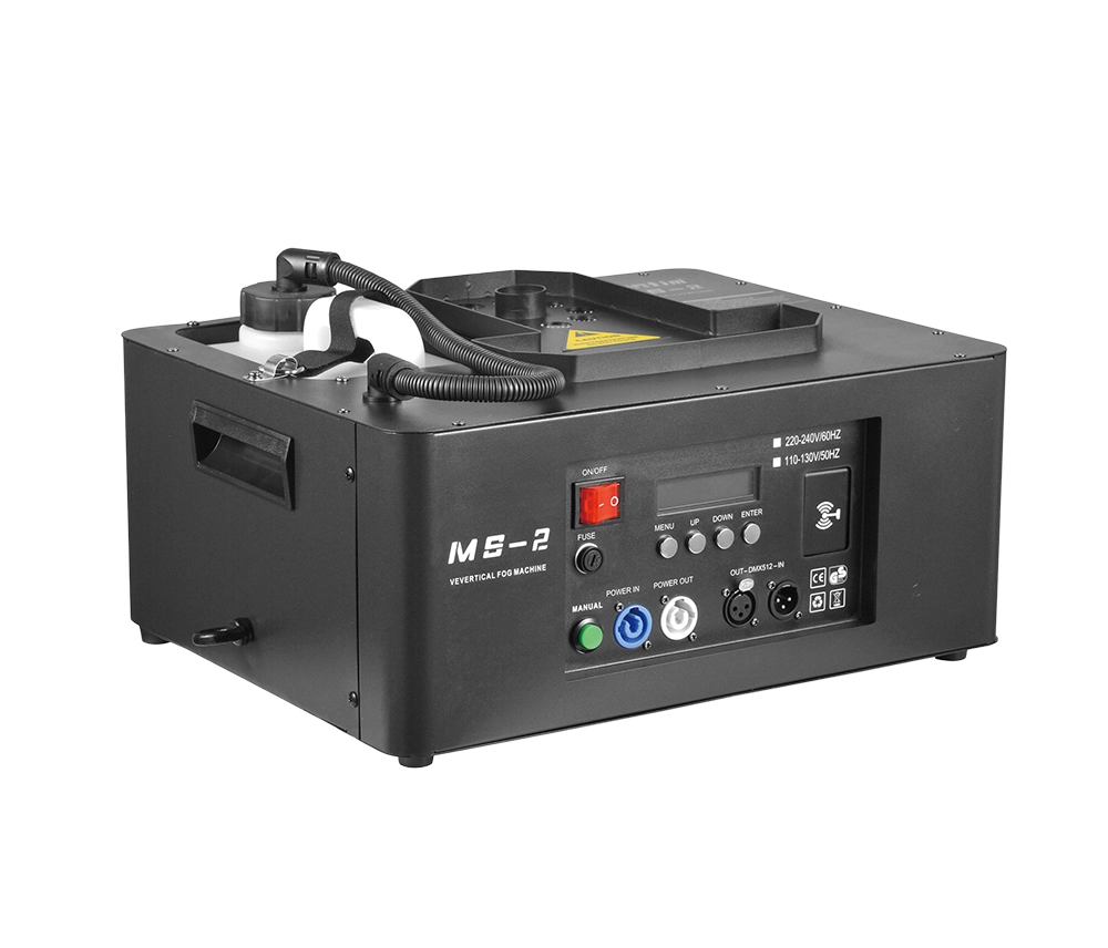 Светодиодная вертикальная дым машина MS-2 с быстрым распылением, может быть расположена горизонтально с направлением струи вверх, или ее можно подвесить вверх дном и направить струю вниз, а также фиксировать под разными углами.