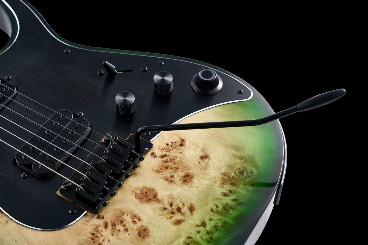 Резонансный результат этой комбинации клена, палисандра, ольхи и тополя впечатляет и усиливается нековым звукоснимателем GTRS HMT-1N и бриджевым GTRS HMT-1B. Благодаря черному 2-точечному бриджу GTRS PW гитара также получает дополнительную стабильность настройки и практичность тремоло, что является значительным улучшением по сравнению с оригинальным бриджем GTRS M1 на M800. Накладка грифа M810 украшена великолепной инкрустацией перламутром, добавляющей красочный блеск. В этом современном дизайне все еще присутствуют классические элементы гитары, такие как трехпозиционный переключатель, ручки тона и громкости, а также крепление для гитарного ремня.