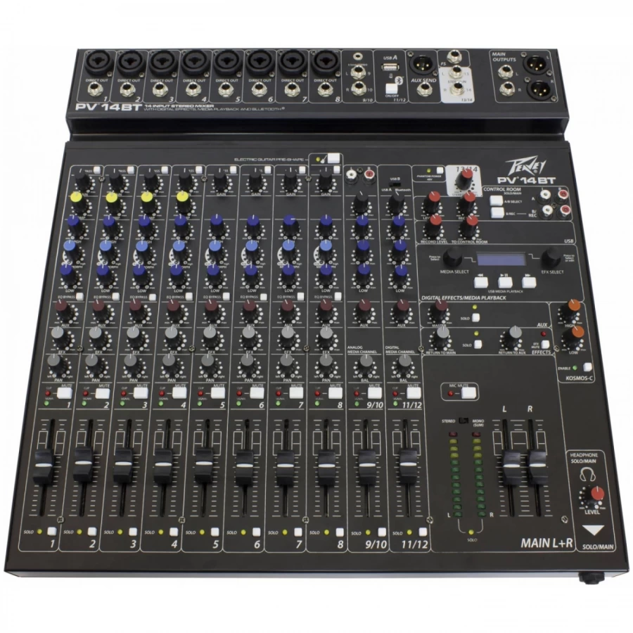 Peavey PV 14 BT имеет 8 микрофонных преампов, 8 прямых выходов для звукозаписи, стереоканал, медиаканал по беспроводному подключению Bluetooth®, высококачественные встроенные звуковые эффекты, выход USB, функцию воспроизведения MP3-файлов через USB-A. Также PV 14 BT оборудован эксклюзивной технологией улучшения звука Peavey Kosmos, 48-вольтным фантомным питанием, двумя выходами на Control Room, четырьмя каналами компрессии, гитарным преампом, 3-канальным эквалайзером с функцией Вураss, кнопками заглушения каналов и множеством прочих функций, делающих этот универсальный микшер идеальным для любых сфер применения.