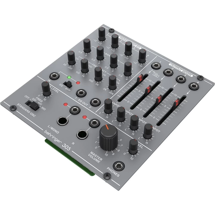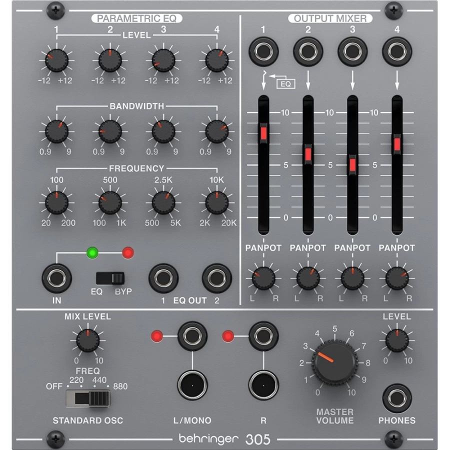 305 EQ/Mixer/Output совмещает в своем весьма компактном для своих возможностей корпусе размера 24HP 4-канальный микшер, 4-полосный параметрический эквалайзер, осциллятор и блок выходного усиления. Это незаменимое устройство для любого модульного синтезатора, которое позволяет транслировать его звучание на любые акустические системы или наушники.