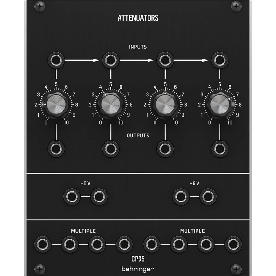 CP35 Attenuators выполнен в крайне удобном еврорэк формате размера 21HP, практически не требует питания и может работать как с аудио, так и с CV сигналами. Здесь реализовано сразу 4 независимых аттенюатора, способных полностью заглушать сигнал. Для подключения предусмотрено 4 входа и 4 выхода на коннекторах mini-jack 1/8". Важно отметить, что блок аттенюации можно использовать как сплиттер, так как входные разъемы соединены между собой и если коннектор вставлен только в крайний левый разъем - сигнал будет дублироваться на все входы. При подключении коннектора в свободный разъем его связь со входом левее обрывается.
