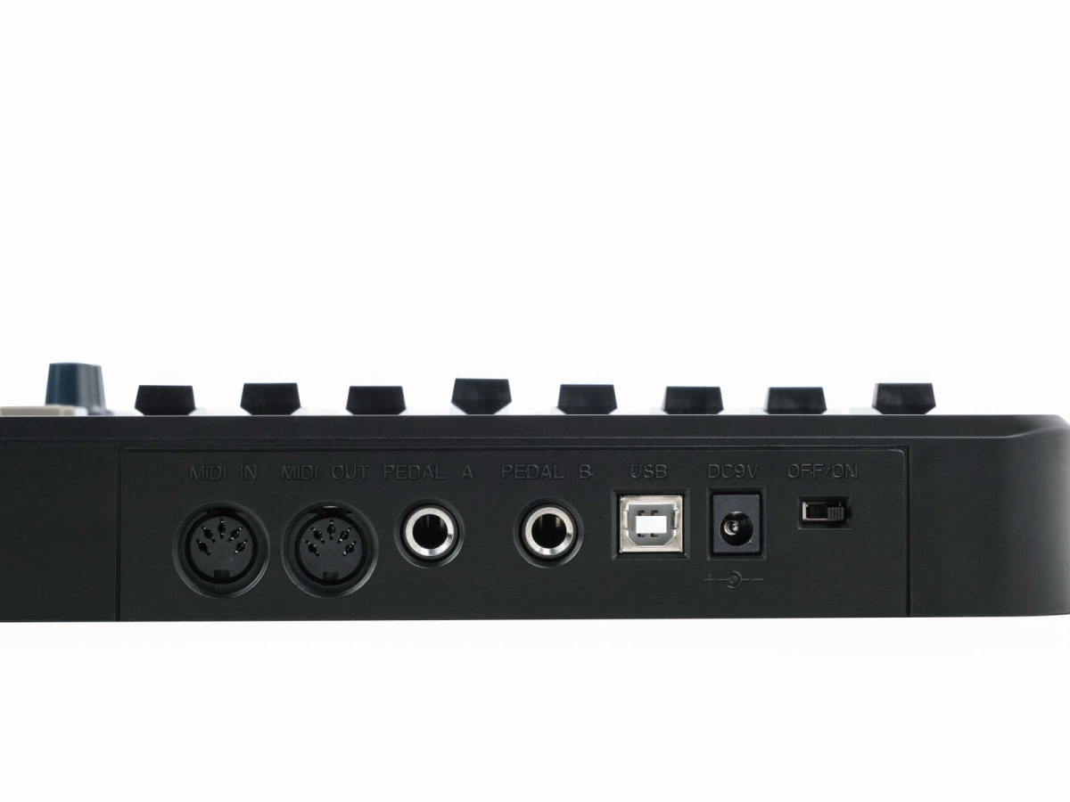 16 пэдов с динамической чувствительностью. 5 назначаемых поворотных ручек.