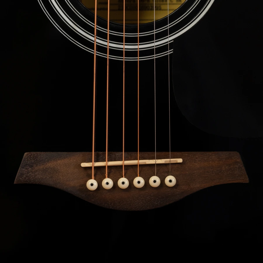 Струнодержатель (бридж) из палисандра: Бридж из палисандра дарит гитаре изысканный и благородный внешний вид, и насыщает звук характерными обертонами. Благодаря идеальному контакту струнодержателя с поверхностью деки колебания струны без потерь передаются на корпус инструмента.