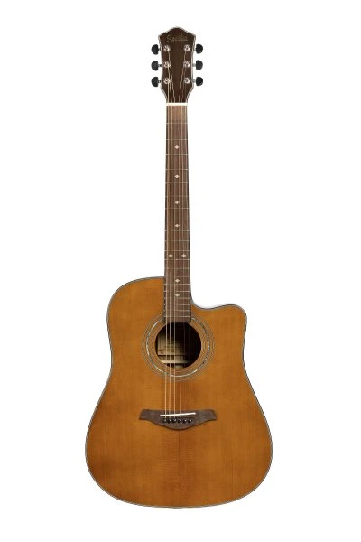 Верхняя дека вестерн-гитар DS-400 изготовлена из цельного кедра, нижняя дека, обечайка и гриф - палисандр, накладка грифа и бридж - перикопсис. На гитарах установлены металлические струны.