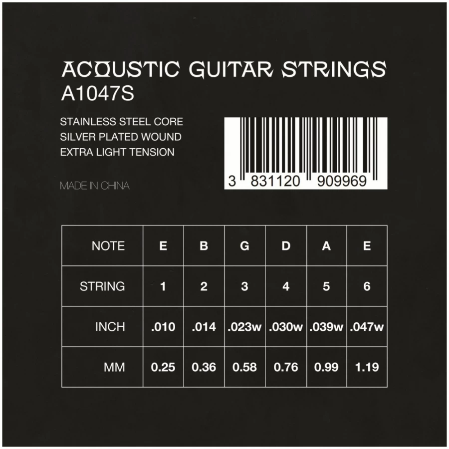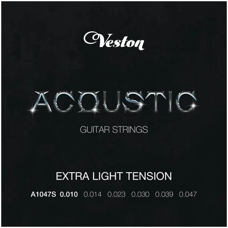 Струны VESTON модель A1047 S для акустической гитары, изготавливаются из нержавеющей стали с посеребренной обмоткой.