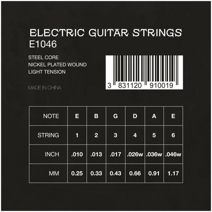 Диаметр струн, дюйм (мм): E-1я/0.010 (0,25),B-2я/0.013 (0,33),G-3я/0.017 (0,46),D-4я/0.026 (0,66),A-5я/0.036 (0,91),E-6я/0.046 (1,17).