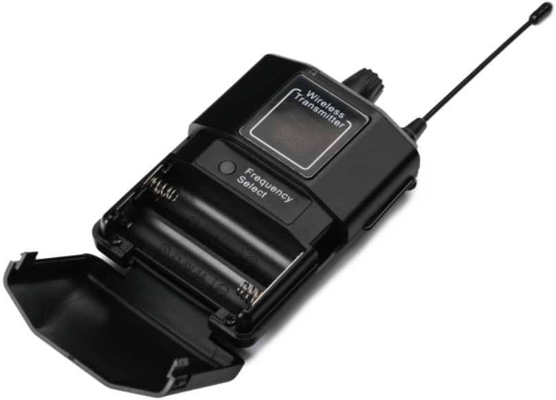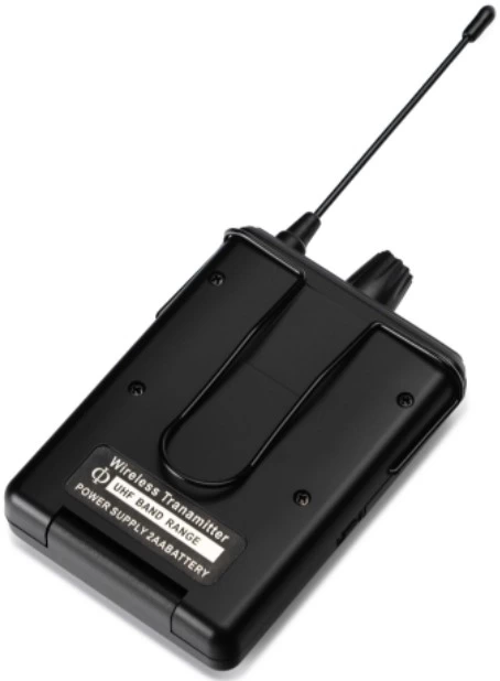 Это компактный поясной передатчик, выполненный из прочного пластика. Над кнопкой включения имеется небольшой дисплей, на котором отображается рабочая частота, уровень заряда батареи, а также качество передачи радиосигнала. Работает данная модель на одной из 10-и доступных частот, которую можно выбрать вручную при помощи кнопки на корпусе передатчика. Возможность выбора частоты позволяет использовать до 10-и таких систем одновременно. Работает передатчик от двух батареек типа АА.
