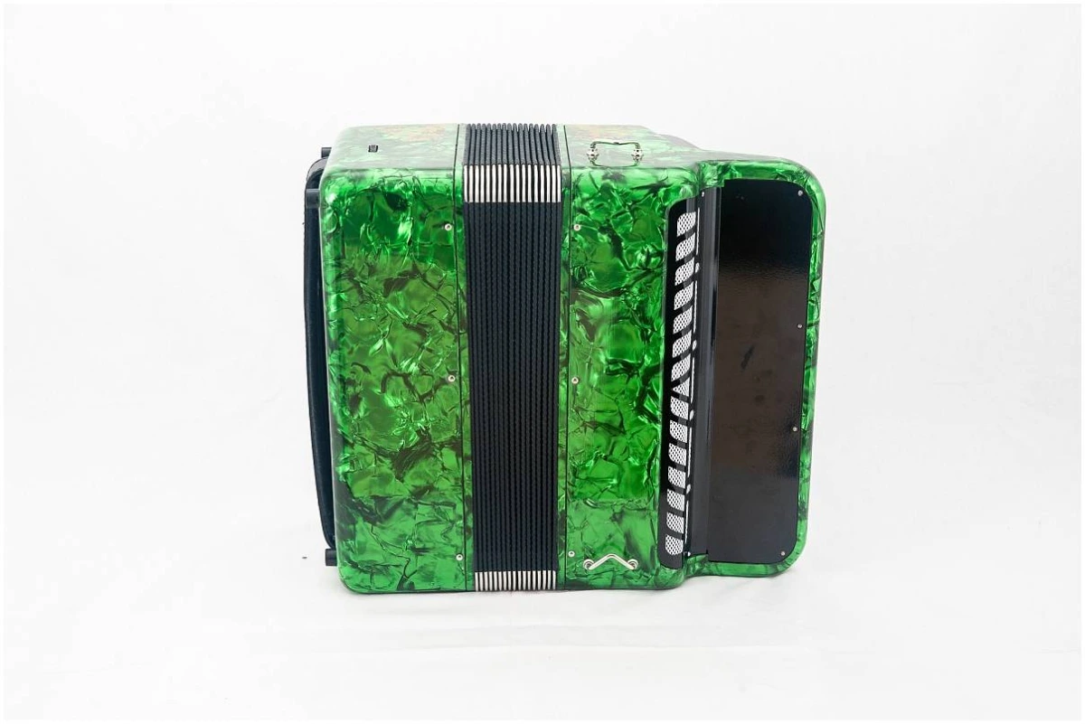 Трехрядная правая клавиатура двухголосное звучание 46 нот от ноты МИ малой октавы до ноты ДО диез четвертой октавы, в левой части (басы) готовый аккомпанемент от ноты "фа" контроктавы до ноты "ми" большой октавы с одновременным звучанием в четырех октавах.