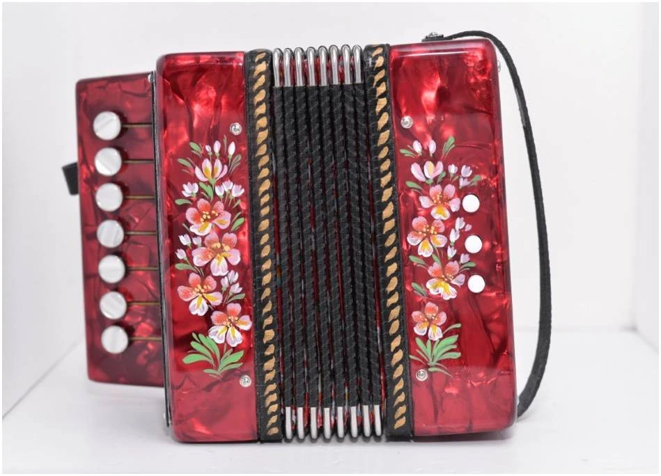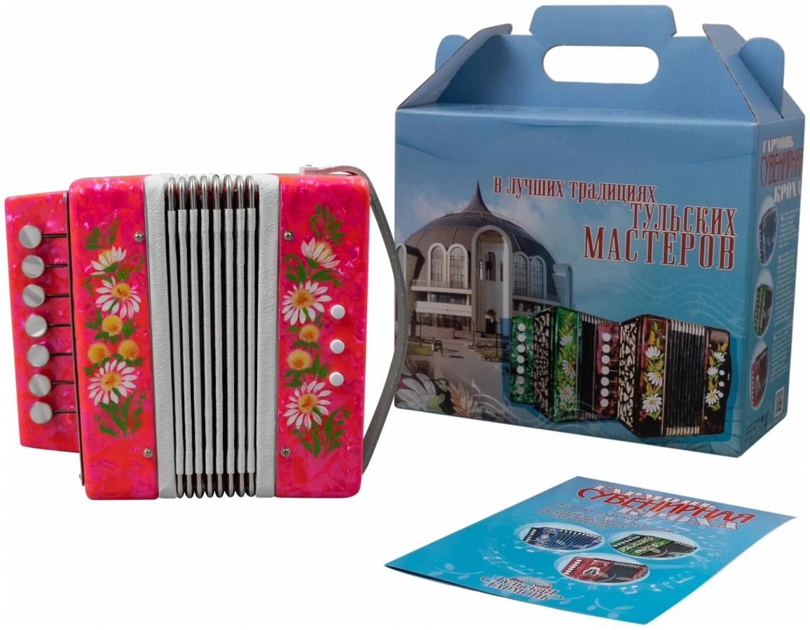 Одноголосная, однорядная гармонь, предназначена для использования в качестве сувенира, а так же для исполнения несложных музыкальных произведений. Корпус гармони облицован высокохудожественным целлулоидом различных цветов и имеет художественную роспись, выполненную в русских традициях.