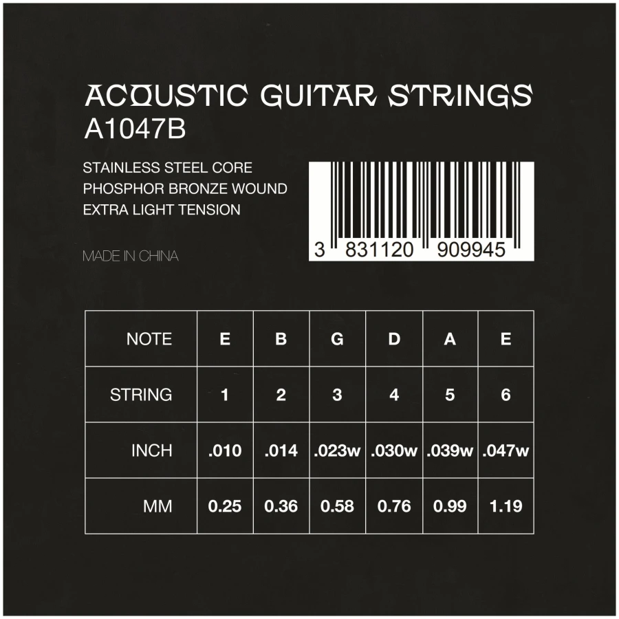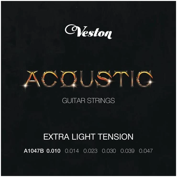 Струны VESTON модель A1047 B для акустической гитары, изготавливаются из нержавеющей стали с обмоткой из фосфорной бронзы.