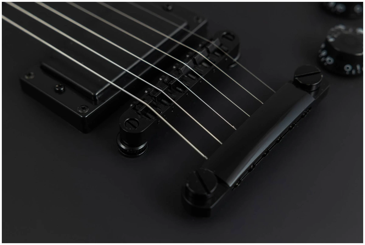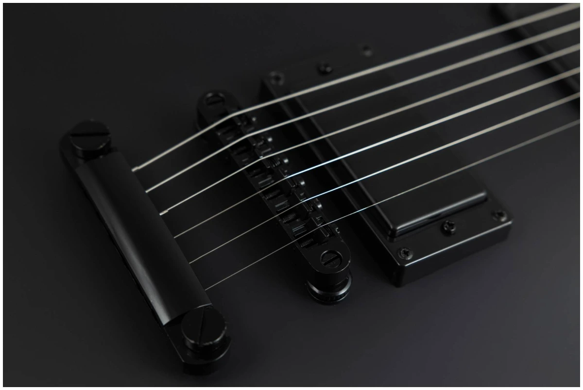 Конфигурация звукоснимателей HH позволяет получить сигнал гораздо более «мясистый», с большим количеством низа и низкой середины в спектре. Именно за это инструменты с конфигурацией HH выбирают гитаристы, отдающие предпочтение игре на перегрузе, играющие тяжелую музыку. Черный цвет хамбакеров отлично сочетается с черной фурнитурой. Гриф из клена с накладкой из амаранта, 22 лада. Бридж stoptail, струны сквозь корпус. Инструмент выполнен в стильном черном цвете с матовым покрытием и головой грифа в цвет корпуса.