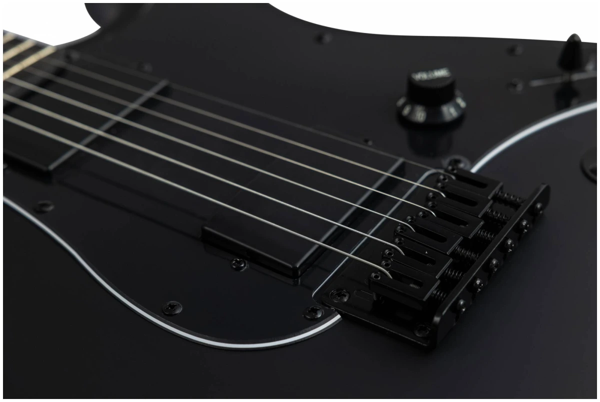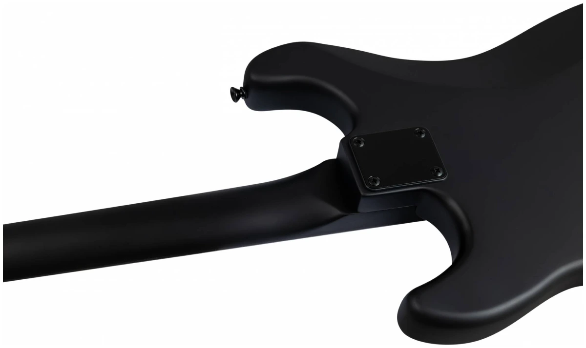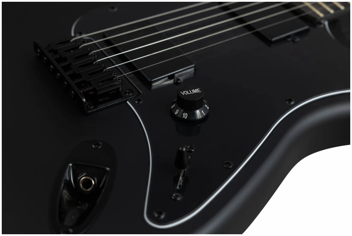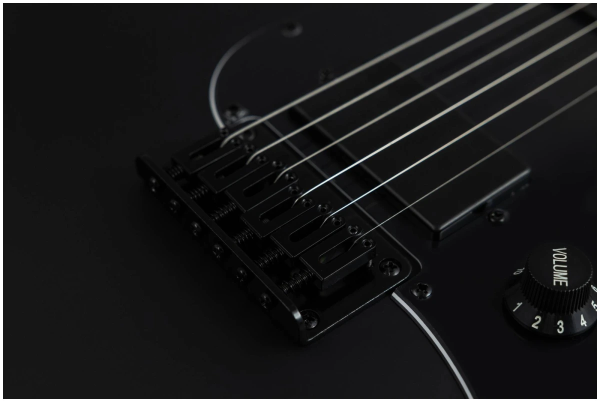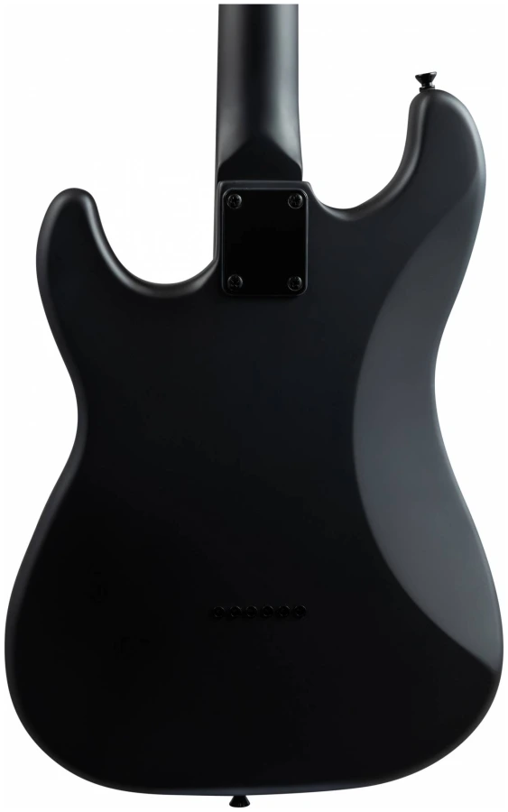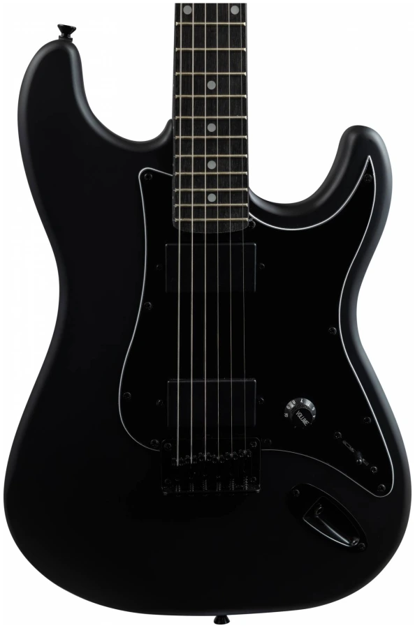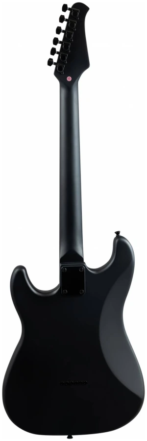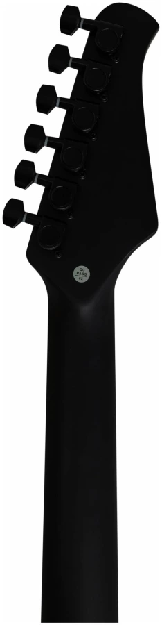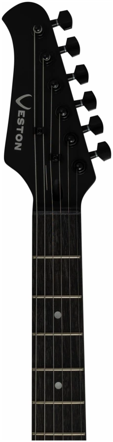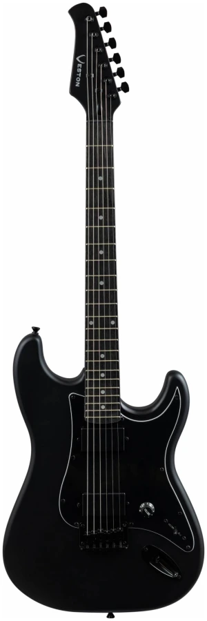 VESTON EST-BK - электрогитара в корпусе стратокастер из серии Extremo в черном матовом цвете с черным пикгардом и черной фурнитурой. Конфигурация звукоснимателей HH. Две катушки хамбакера позволяют получить сигнал гораздо более «мясистый», с большим количеством низа и низкой середины в спектре. Именно за это инструменты с конфигурацией HH выбирают гитаристы, отдающие предпочтение игре на перегрузе, играющие тяжелую музыку. Черный цвет хамбакеров отлично сочетается с черной фурнитурой и реверсной головой грифа, все вместе придает гитаре еще более суровый метальный вид.