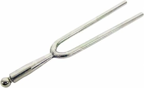 Легкий и портативный вилочный камертон представляет собой металлическую вилку с двумя длинными зубцами, которые, если ударить по ним, начинают вибрировать с определенной частотой, издавая звук.