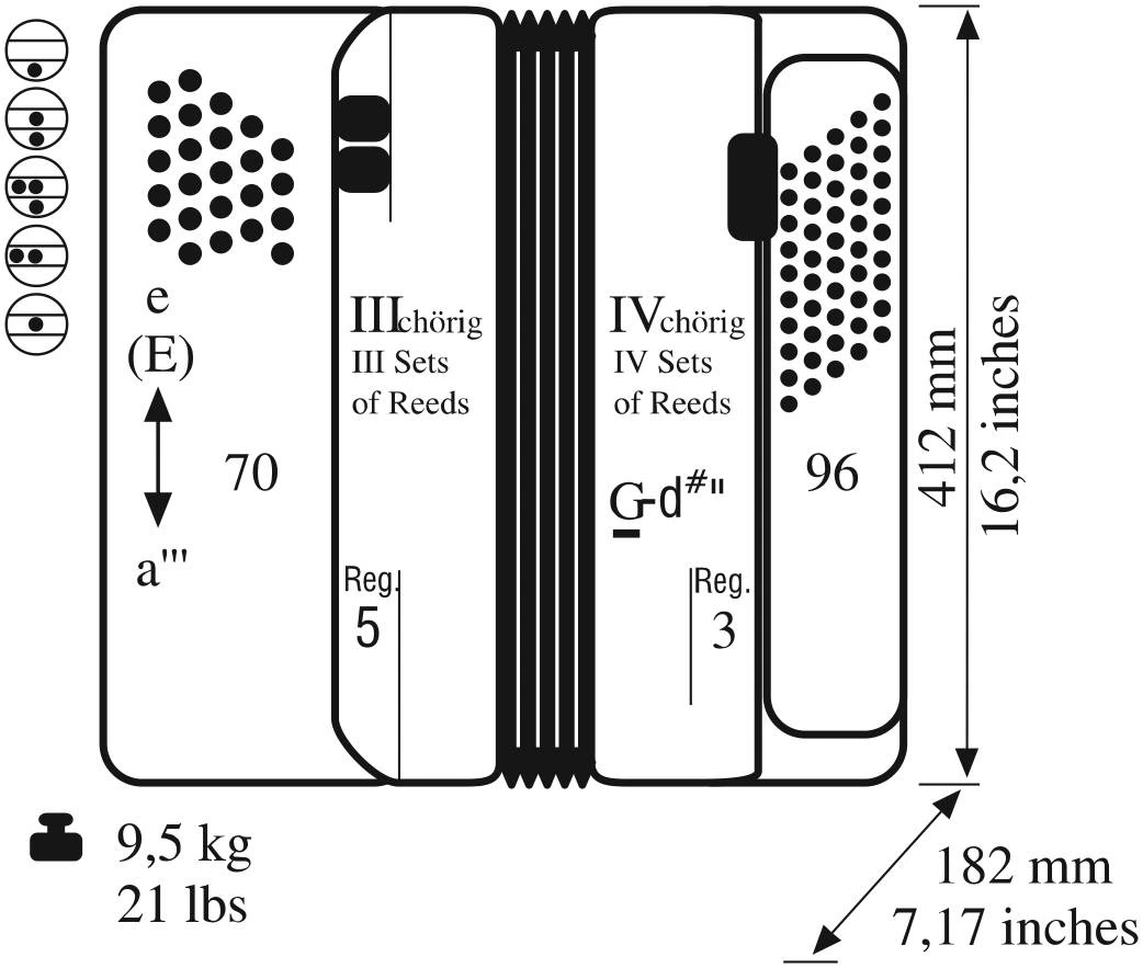 WELTMEISTER Romance 703 можно с полной уверенностью рекомендовать для серьёзных занятий музыкой в музыкальной школе и, ввиду относительно небольшого размера и массы - для концертной работы. Баян весит всего 9.1 кг, зато диапазон звучания 42 тона, как у большого клавишного аккордеона. 3 голоса в дисканте дают музыканту большую сферу для творчества, 5-рядная клавиатура позволяет уравновешанную игру, а бас с 3 тембрами дополняет баян.
