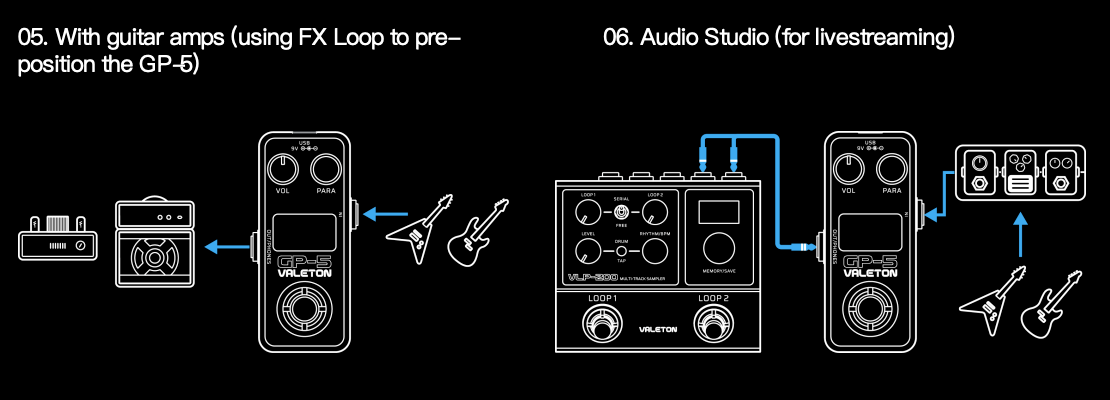 Каждый элемент Valeton GP-5 создан с учётом нужд музыкантов. Яркий LCD-дисплей высокого разрешения обеспечивает наглядное и интуитивное управление настройками. Умная кнопка-футсвитч с LED-индикатором поддерживает четыре режима работы: Preset, Setlist, Stompbox и Tuner/Bypass, позволяя адаптировать управление под любые задачи. Подключения продуманы не меньше: доступны аналоговый и цифровой байпас, полноценный стерео-выход 6,35 мм TRS и возможность работы с наушниками — кристально чистый звук гарантирован и при тихих репетициях, и на сцене.